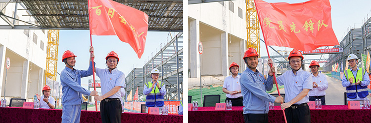 隨后,王立貴向揭陽項目建設團隊和盛元達黨支部分別授予了“百日會戰”旗和“黨員先鋒隊”旗。鮮艷的旗幟在空中迎風飄揚,宛如翱翔的雄鷹,昭示著揭陽團隊在接下來的百日大會戰中將奮勇爭先、爭創佳績。